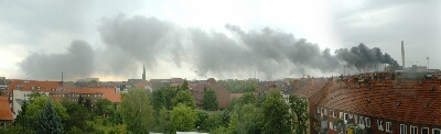 Ein sensationelles Ereignis erlebten wir am vergangenen Donnerstag. Um ca. 12.30h störten uns beim Mittagsschlaf die Sirenen der Feuerwehr. Doch aus diesem Ärgernis sollte sich bald eine für uns positive Nachricht entwickeln. Auf dem Weg ins Erdgeschoss des Stadthauses bekamen wir mit, dass die Feuerwehr direkt nebenan die ersten Schläuche ausrollte. Der Blick nach oben verriet sofort alles - ein Großbrand in dem Gebäude, das gerade abgerissen wird. Das Positive darin erkannten wir natürlich direkt - Erst einmal zuschauen und keine Arbeit mehr! Und das dachten natürlich nicht nur wir. Alle Beamten rannten wie von der Biene gestochen Richtung Innenhof, wo die große Sause abging. Es fehlte wirklich nur noch ein Getränkewagen. Der hätte wahrscheinlich ordentlich Gewinn erwirtschaftet. Nach und nach breitete sich der Brand ordentlich aus und die ersten Teile lösten sich vom abbrennenden Kraftwerk und donnerten zusammen mit den Blitzen des Gewitters nach unten. Die Feuerwehr evakuierte den Innenhof und zu unserer Freude auch das Parkhaus. Ja, und genau hier stand auch unser Auto, mit dem wir losdüsen mussten in Richtung Uferrandstreifenkontrolle. Klartext: Den Rest des Nachmittags erarbeiteten wir uns Überstunden im Büro bei Kaffee und Internet.